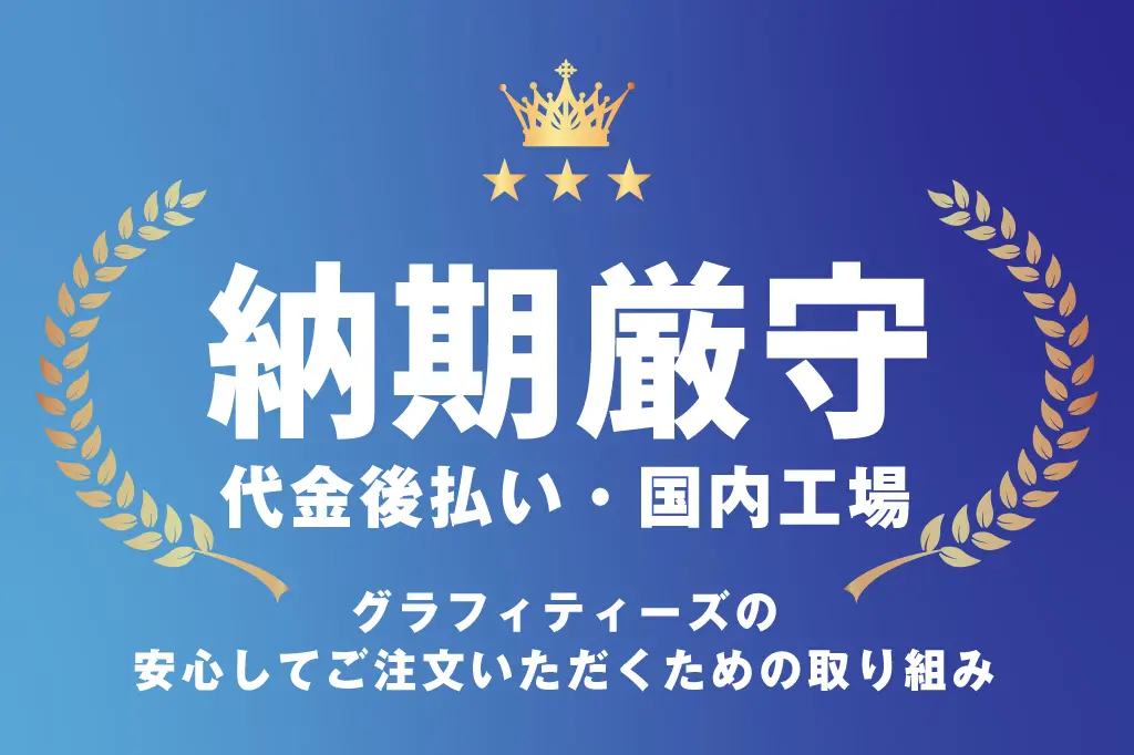 日本国内で加工・検品を行うため、納期も品質も安定。急な再プリントにも対応可能です。